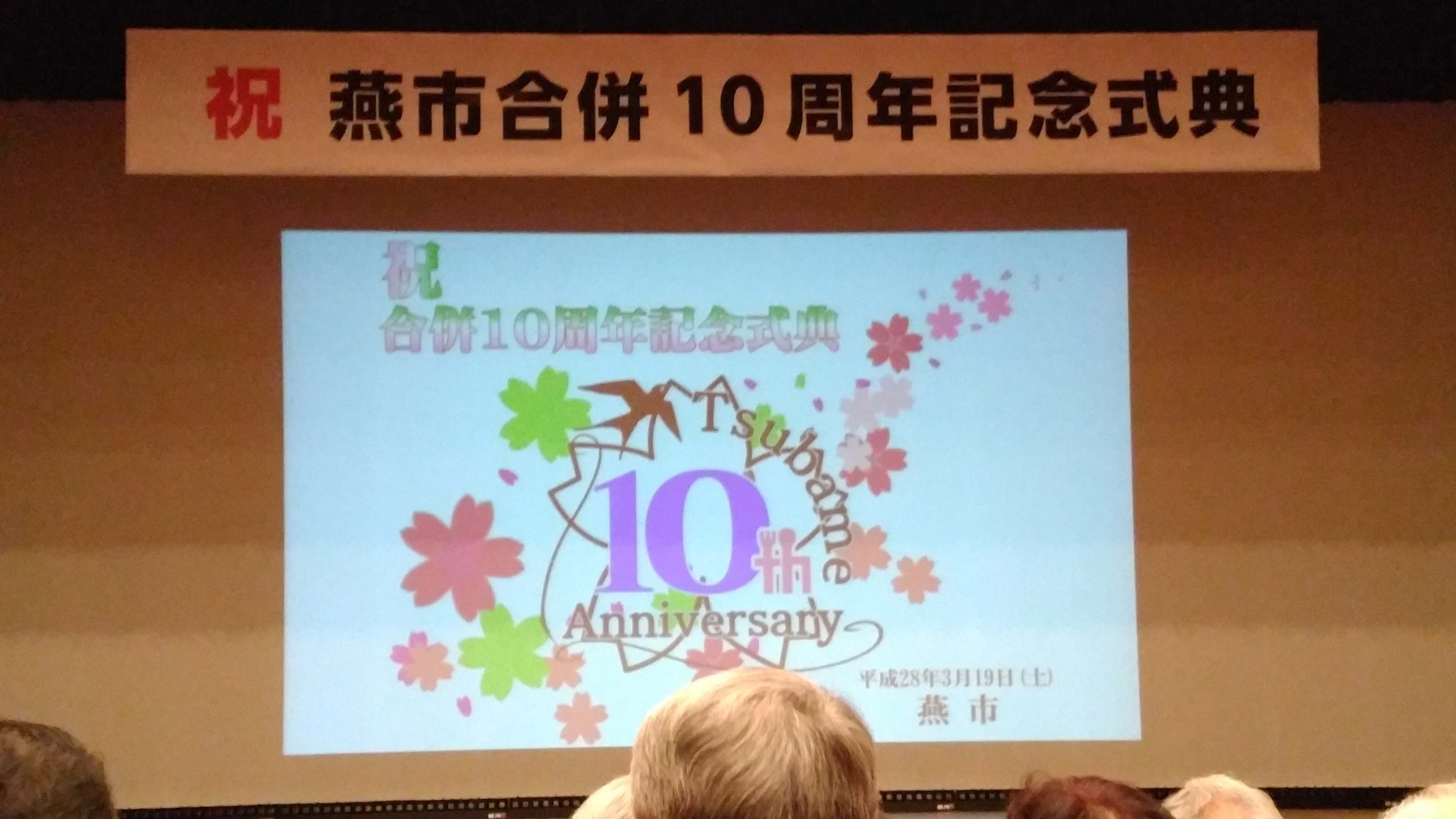 午前10時より燕市文化会館で挙行された『燕市合併10周年記念式典に出席。県内首長や議会関係者や国会議員も参列して、祝辞や合併後10年の歩みの市職員手作りの記念映像が上映されたり、市内保育園園児による「つばめっこかるた」の紹介があり、12時前に閉式となりました。