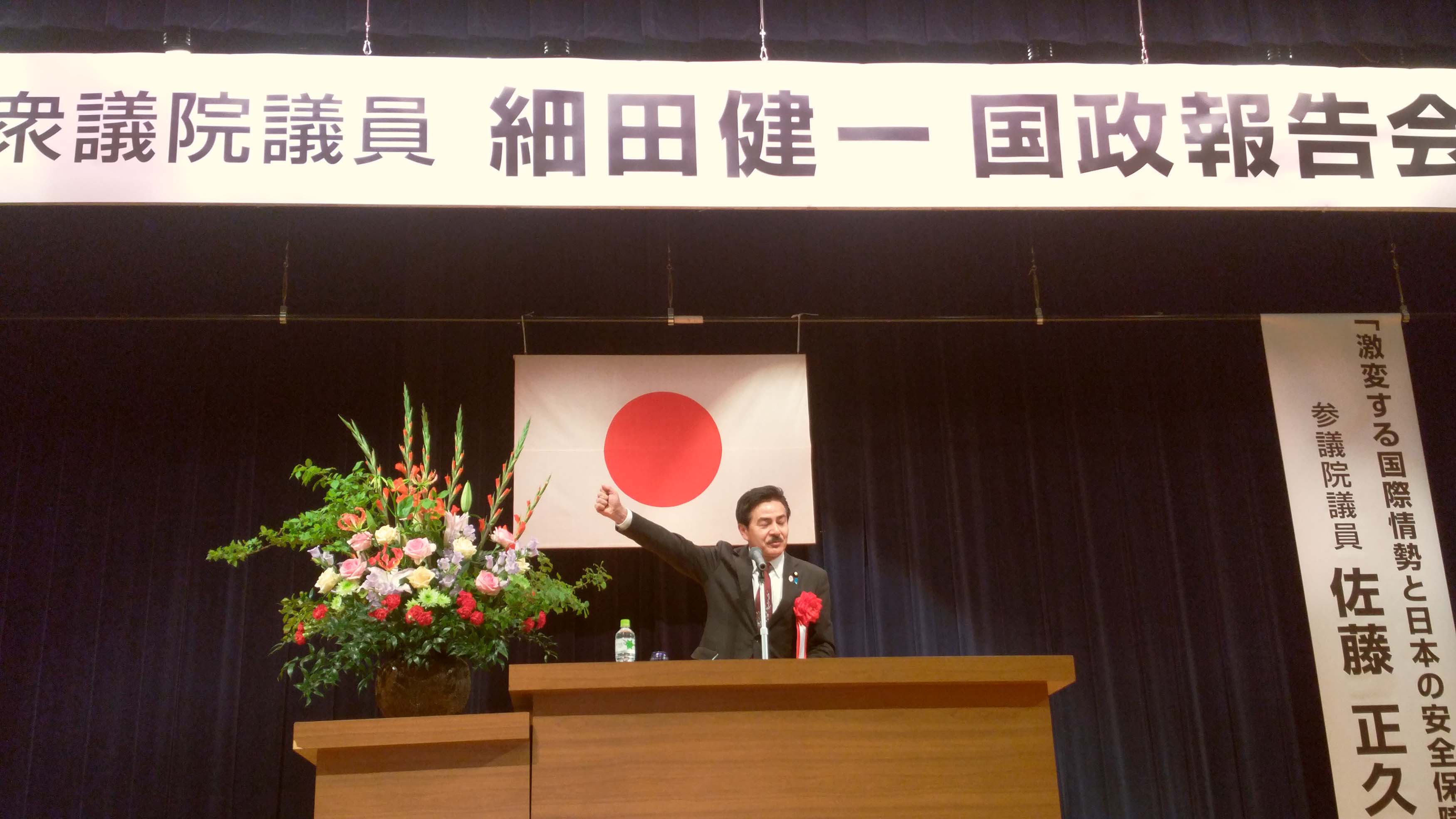 自分を含めて塚田一郎・中原八一両参議院議員など来賓の挨拶の後「ひげの隊長」でお馴染みの参議院議員佐藤正久先生を講師に「激変する国際情勢と日本の安全保障」と題した講演があり、その後、細田代議士のこれまでの取り組みと今後の抱負などの報告がありました。