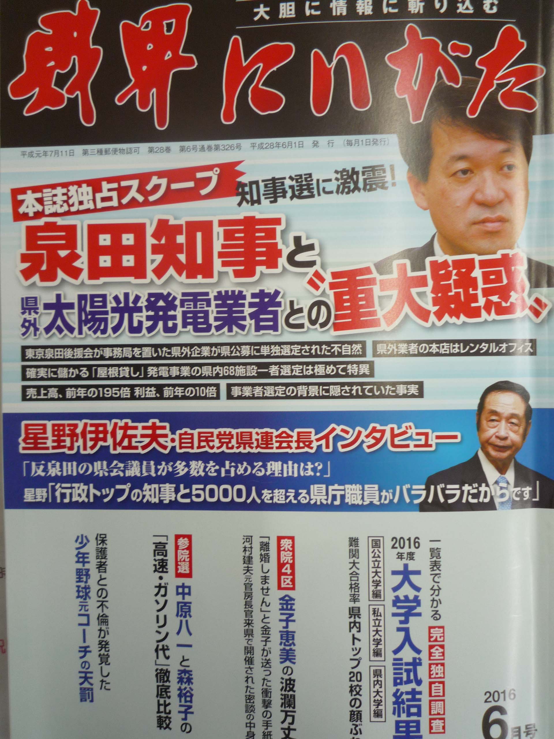 本日発売の地元経済誌に泉田知事の『重大疑惑』の大見出しに驚愕。最近の同誌の取材力は強化してきていると感じていましたが、事実関係を議会でしっかりと解明しなければなりません。