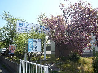 満開の事務所の八重桜