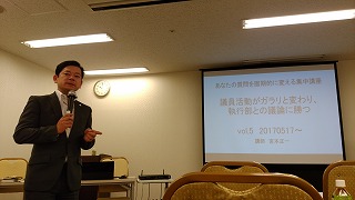 講師は 宮本 正一氏で、平成07年に寝屋川市議会議員に当選以来、5期20年の議員在任中、市議会議長及び橋本徹大阪府知事選挙を始め数々の選挙に携わり、日本でただ一人医学博士とMBAを持つ市議会議員(~平成27年)として活躍され、現在は「医療・健康問題研究所」及び「日本公共経営研究所」代表を務める傍ら、同志社大学生命医科学研究院をも務めています。