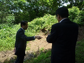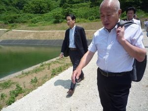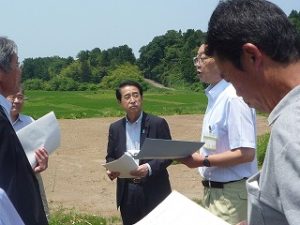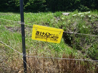 最初にイノシシがエサの根を掘り起こすことから用水路が塞がるという被害現場を案内してもらった後、昨年基盤整備が終了したばかりの田んぼへ移動し、田んぼでの電気柵の設置状況を視察。