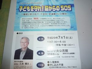 14時燕市中央公民館において、県立燕中等教育学校を支援する会主催の『29年度教育講演会 子どもを守れ!脳からのSOS』と題した、熊本大学名誉教授で医学博士 三池 輝久氏の講演を聴きました。