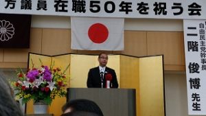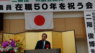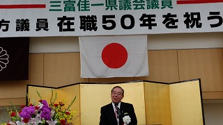 15時より、柏崎市民プラザで開催のわが党県議団長三富佳一先生の『地方議員在職50年を祝う会』に出席。