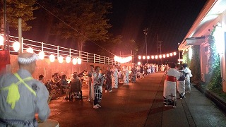 市内民謡団体や近くのご婦人団体などのボランティアの皆さんの踊りや、商工会有志の模擬店などもあり、未だまだお元気な入所者が手振りで調子を取ったり、その家族(お顔見知りの多い事)が一緒に喜んだり、加えて浴衣姿での施設職員や地元関係者で賑わいを見せていました。