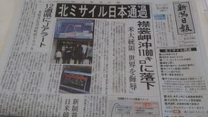 その後北海道上空を通過し太平洋上に落下した模様ですが、ミサイル発射を繰り返す危険極まりない隣国と今後もこんな状態がいつまで続くのでしょうか。