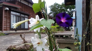 我が家のユリと朝顔の微妙なコラボ