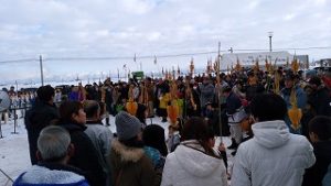 14時10分頃、近郷では最大と思われる道の駅久賀美(国上)の駐車場を使った『第13回久賀美賽の神』にお邪魔しました。時間まで甘酒や豚汁を堪能しながら14時50分のご祈祷の後、15時に子どもたちと一緒に稲わらを使って点火。