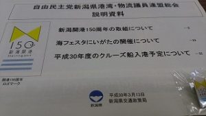 お昼の休憩時間に開催の『港湾・物流議員連盟総会』に出席。新潟港開港150年に合わせたイベントなどについて交通政策局より説明がありました。