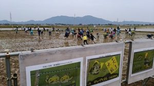 【田んぼアート】 9時より小雨模様の中、燕市吉田ふれあい広場西側の水田40aを使っての『田んぼアート田植えイベント』に参加。