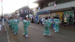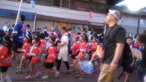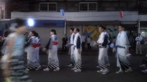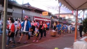 浴衣に着かえ、19時からの燕ばやし大会に臨みました。約2000人の踊り子や子供たちが1時間に亘ってメーンストリートを流しました。