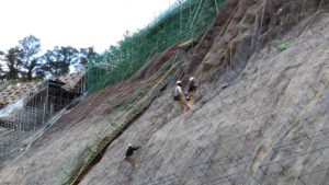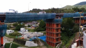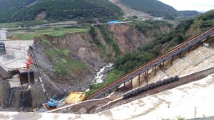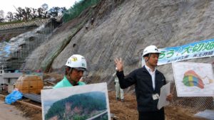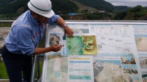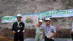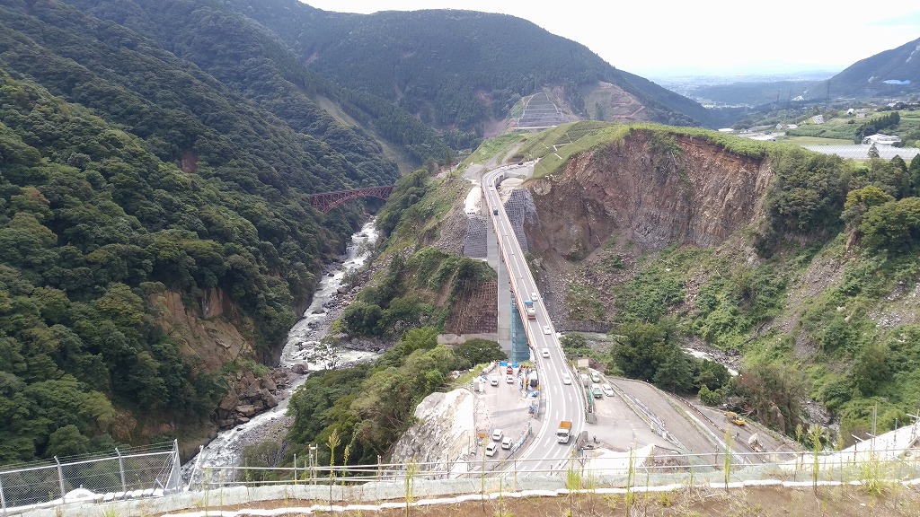 13時30分頃から平成28年熊本地震で大規模な崩壊が起きた阿蘇大橋の復旧現場を視察。