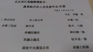 18時より、市内花見地区基盤整備組合・農事組合法人花見新年会に出席。約80名が出席しての懇親会に先立ち、4月7日の県議選に対して私への推薦と激励のガンバローコールを頂き、恐縮するとともに感激でした。