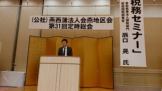 16時、燕西蒲法人会燕地区会総会に来賓出席。その後の税務セミナー及び懇親会までお付き合いさせて頂きました。