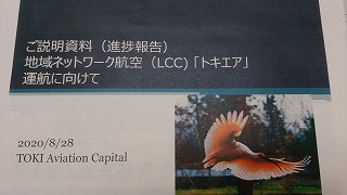 12時15分、トキエアーの現況報告会に出席。同社の長谷川社長から、県交通政策局空港課長も同席し設立準備や今後の進め方等について報告とお願いの後意見交換。