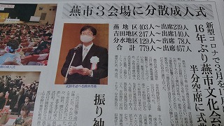 14時、本来は3月に開催が予定されていた燕市成人式が紆余曲折の末、コロナ対策を講じた上3会場に分散してようやく開催されることになり、自分は燕文化会館会場の方に出席しました。