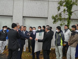 本会議に先立ち、自民党県議団長の石井 修先生から議会棟前に大変立派な西洋シャクナゲの寄贈があり、花角知事や石井先生と植栽関係者一同で記念撮影をしました。