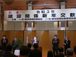 12時、新潟県建設業関係団体新年交換会に来賓出席。当初予定されていた会食も中止になり、乾杯の発生のところを三本締めを仰せつかりました。