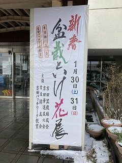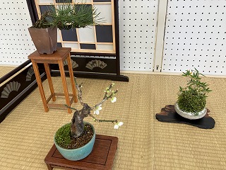 10時過ぎ、吉田公民館で開催の『新春盆栽と生け花展』にお邪魔しました。書道やパッチワークの会も共催出品されていました。