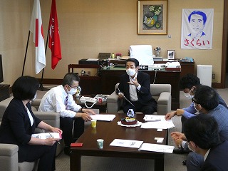 15時前、県立吉田病院で小児科医を歴任された柳原俊雄先生と理学療法士の松宮孝子さんが、これまで関わってこられた小児在宅医療を必要とする重度心身障碍児者の県央地域における今後の体制整備について、福祉保健部松本部長他担当職員との意見交換に同席。