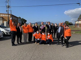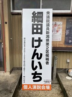 14時45分、弥彦大鳥居前コンビニ駐車場での街頭演説。