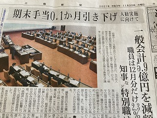 13時、臨時議会開会。人事委員会より勧告の期末手当の0,1か月分引き下げのための議案提案があり、我が党の小林一大政調会長を始めとして3名がそれぞれの立場で質疑を行いましたが、採決の結果は共産党以外は賛成という事で約5,9億円減額の補正予算が可決されました。