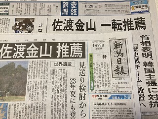 昨日18時30分の岸田総理の記者会見で佐渡島金山世界遺産登録推薦を表明されたことで、今朝は地元紙はじめ各紙の1面を大きく飾りました。