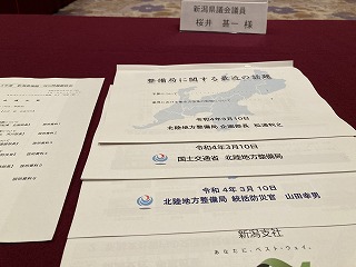県土木部・北陸地整・ネクスコ東日本より、頻発する災害対応や地方発展のための道路を初めとするインフラ行政などの説明があり、その後活発な意見交換が行われました。