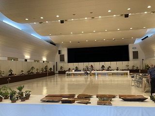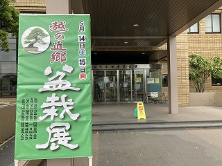 13時30分、ご案内頂いていました吉田産業会館2階大ホールを会場にで開催の第43回越の近郷盆栽展にお邪魔してきました。
