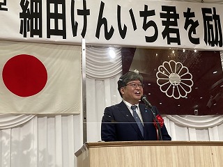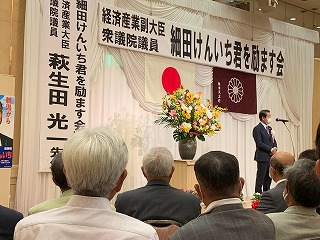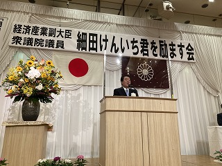 12時30分、経済産業副大臣・衆議院議員 細田健一君を励ます会に発起人の一人として出席しましたが、県連総務会長の立場でお祝いの挨拶をしました。 第一部は代議士の直属の上司である萩生田光一経済産業大臣のご講演。その後第二部は花角知事を始めとした来賓挨拶、最後に細田経産副大臣よりお礼の挨拶で閉会となりましたが、例によって飲食は無し。