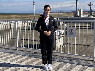 五泉市出身のCAさん。動きやすい制服とスニーカー。