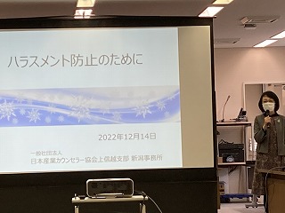 12時、県職OGの安藤氏よりハラスメントについて研修。我々に対する先生という呼称は優位性を表すことから、ハラスメントのリスク要因になり得るという指摘は肝に銘じておかなければなりません。