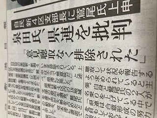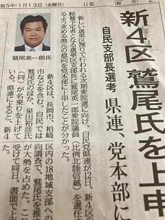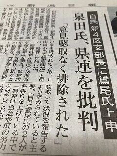 衆議院新4区支部長選任について、相応しい方を1名推薦して頂きたいと県連より18支部への意向調査の、鷲尾先生15支部、県連一任3支部との結果を受けて、党本部へ上申したことに対して、泉田衆議院議員が当事者である自分には何の話も無かったと、県連に対してクレームをつけたことで、マスコミ各社より新幹線車中等問い合わせが多数来ました。