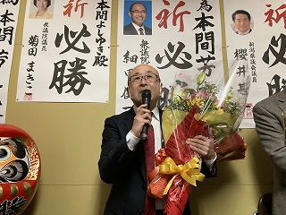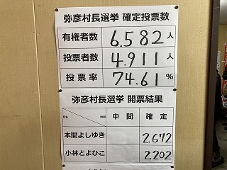 【弥彦村長選】新潟から戻って、夜7時には弥彦村長選候補の本間よしゆき事務所に。 7時40分頃には本間よしゆき氏の当選が決定。