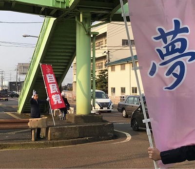 【朝挨拶】 7時30分、自分が統一地方選に向けて思うように活動が出来ないのを見かねて、燕市議団新人有志の皆さんが朝の挨拶を始めて頂いたので、現場で暫く一緒にご挨拶しました。